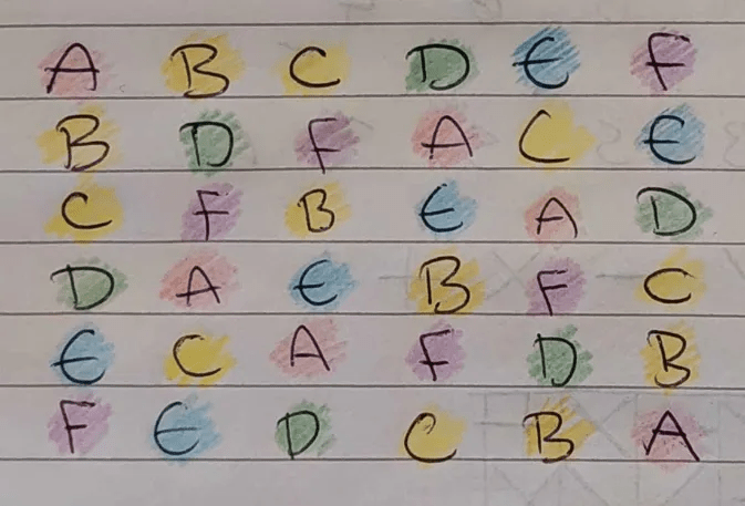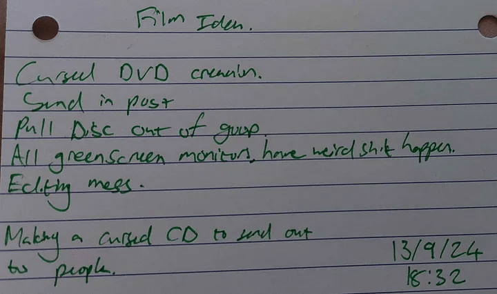 My wife made a turn order schedule (she is a maths person and lover of logic puzzles) that meant that no two directors proceeded or followed one another in separate films. So for example, each person got to start a film, each person got to end a film, and each person always had a different person’s work to follow on from. Isobel made the 6 person version, and my friend Louis made the 9 person version.