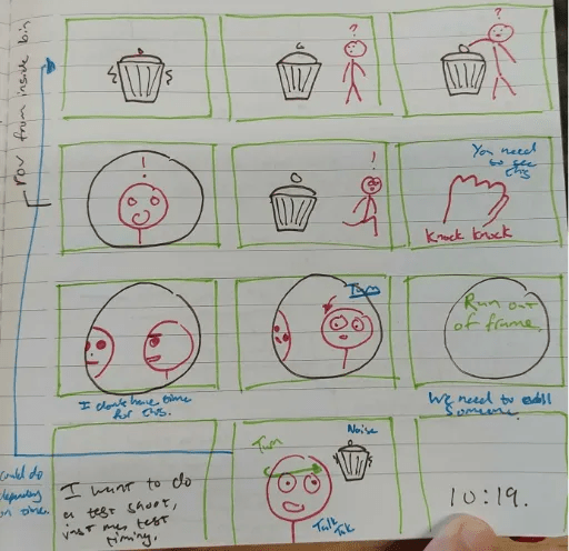 I wanted to create a film where someone was at a construction site chatting away, when they suddenly notice a bunch of noises behind them coming from a bin. They investigate, and are so worried by what they see, that they call their supervisor. Their supervisor, incredulous, goes over to see what is up. After seeing what is in the bin, they also run away.