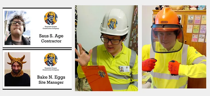 The plan was for me to be the initial construction worker, and for Louis to be my supervisor. I created a bunch of props for this role, and made sure to gather any supplies to help sell the bit.