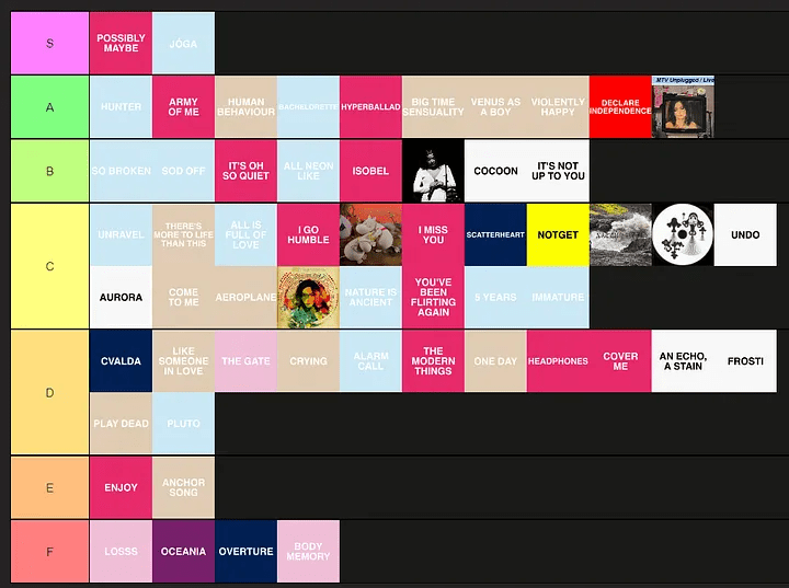 I was watching some Björk music videos, because I think her stuff is rad, but also I wanted to slowly get through her entire discography. I was making a tier list of which of her songs I liked more than others.