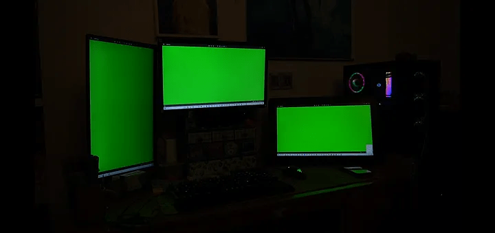 The greenscreen monitors were created by having a jpeg of green opened up on each monitor.