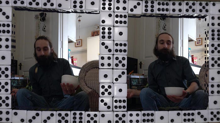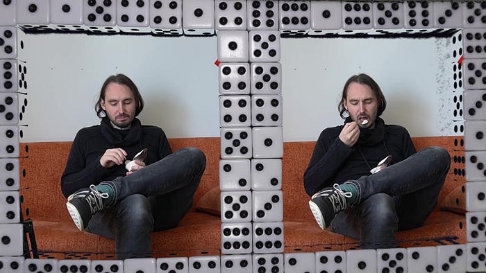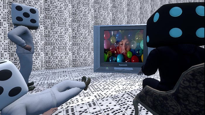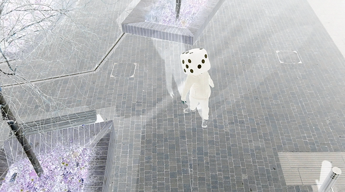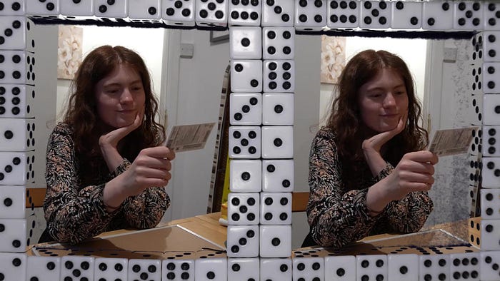 My favourite shot in the film is when all of the 3D dice characters are watching my film ‘Gacha’nce’ which I released a year ago. It is me being surrounded by chance, consumed and buried by it. This was the start of me trying to understand chance as an idea. Cut to my current project, and its me surrounded by chance, surrounded by chance. Not only that, there is the idea of looking back, both by me and by chance itself.