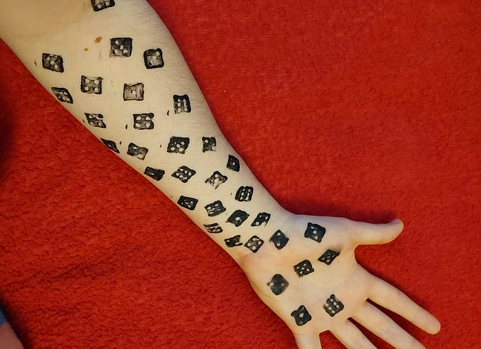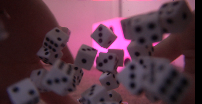 In some of the scenes, stop motion was used to show dice being used as stamps on my skin. Adding to the idea that I was being consumed by chance, staining my skin, branding me. Funny how chance has become part of my identity. I’m not sure if that will change at this point.