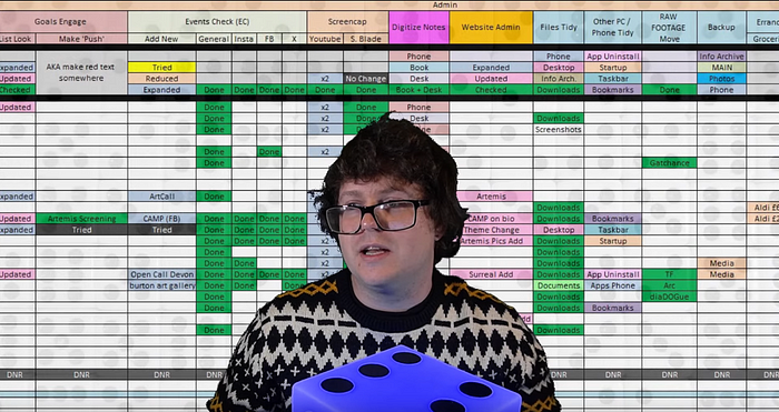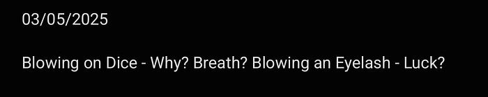 This leads nicely into my initial thoughts of chance and its connection to a higher power. Often, throughout my life, I have decided to ‘let fate decide’ by ‘praying to the Gods of RNG’. In my day to day, I would use RNG to decide what tasks I would focus on — I would have power on what categories there are, but I would let randomness decide which ones I am to focus on. I have been doing it since I was 16 or 17. I realised very early on that I can be very task avoidant, wanting only to do activities which I find to be fun or easy. However, deciding that I would put my hands into something else, where I was not directly making the decision, made it all a lot easier for me. Through this, I started to realise that I was gaining a lot of experiences which I would not have otherwise. Every day was different, my routine being non-stagnant. Chance allowed me to be brave. Its easy to say “one day I want to X or Y”, but the list saying “okay do it” made a lot of these things real when they would not have been otherwise.