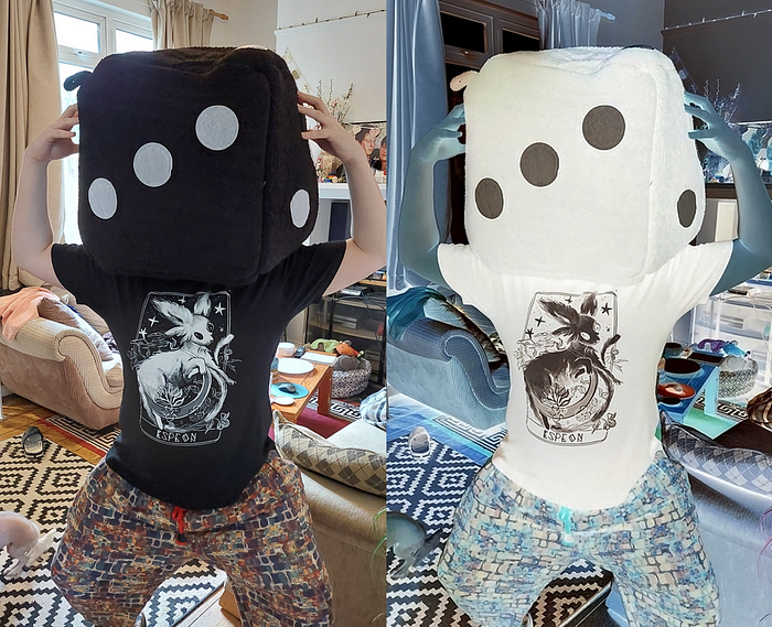 The development of the ‘black dice man’ was a weird turn of events that conjured up some great ideas. Firstly, I had the idea that a cat bed, shaped like a dice could easily become a mask. So I ordered one, and it never arrived. I ordered a second one from a different seller, no dice. Only the black variant were available.