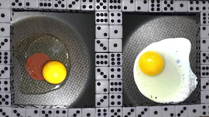 There is a reference to ‘Eggistential’, one of my favourite pieces. In Eggistential, at the end of the film, the shot is reversed. This is quite hard to tell its backwards until the egg is very much un-cooked. It’s kind of interesting that destruction goes both ways. Cooked and uncooked are both destruction, depending on what you see at ‘the object’. In this piece, one side is playing forwards, and one is playing backwards. Again, it is hard to tell in the scene. On a side note, I don’t actually use that pan anymore, I cracked it out just for the shot.