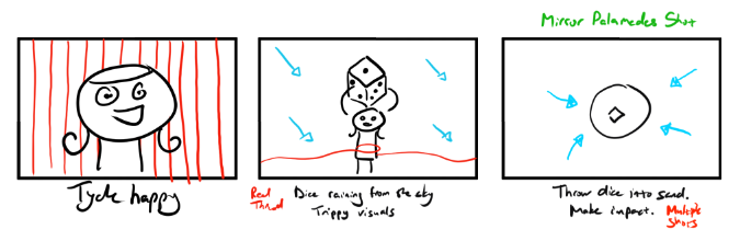 In terms of other ideas, there was originally a plan to have a ‘red string of fate’ motif, with red thread being visible in some scenes, but this was dropped when the black dice man was introduced. I felt that it overcomplicated it otherwise.