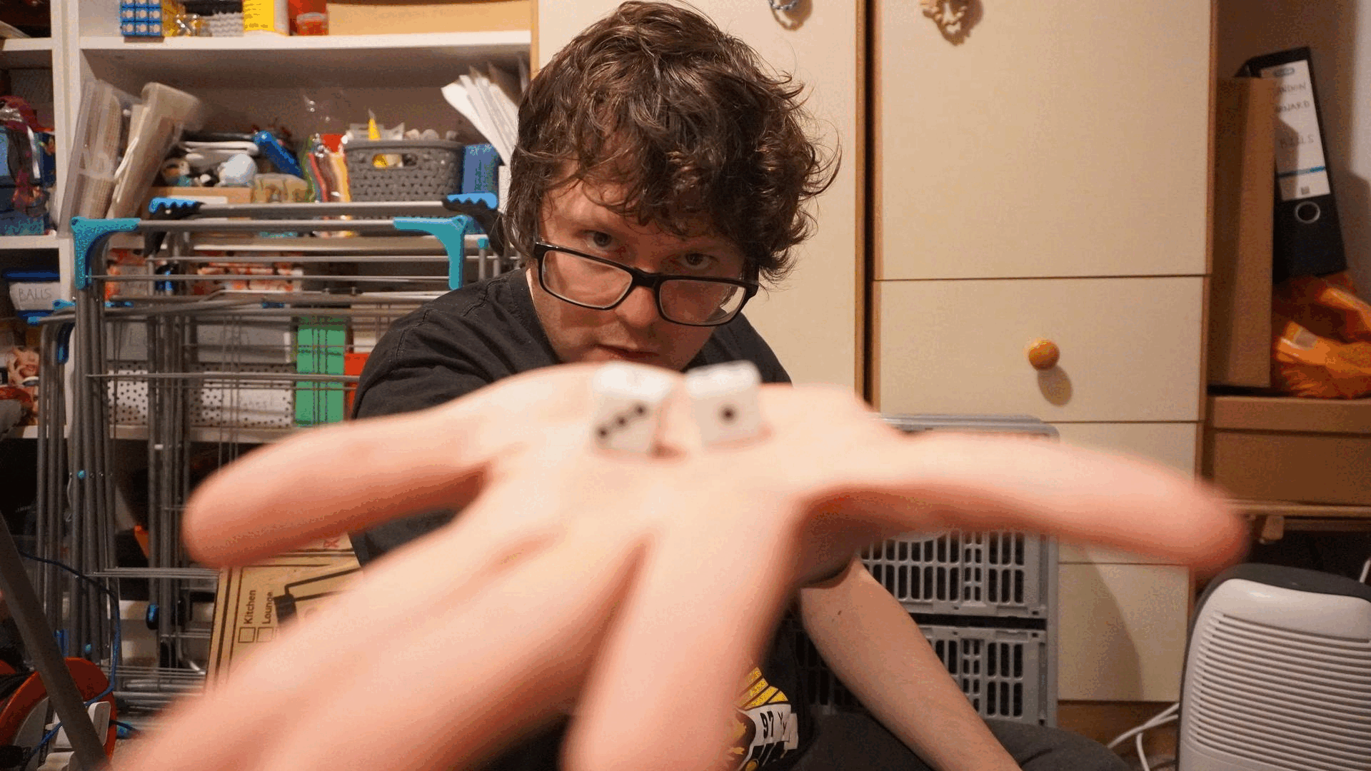 A lot of dice! They were used for many bits within the films. Months after filming these scenes, I am still finding random dice around the house..