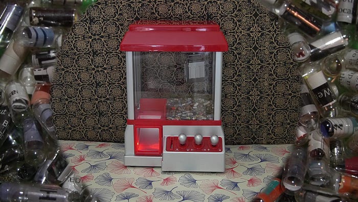 For some context, this film is a series of mini explorations into chance using magazine cutouts as prompts — various words I found such as ‘wool’ or ‘nature’, with no real concrete theme. These prompts were put into pill capsules, and then into a children’s crane game. The crane game was how the prompts were selected, including how many were chosen at once.