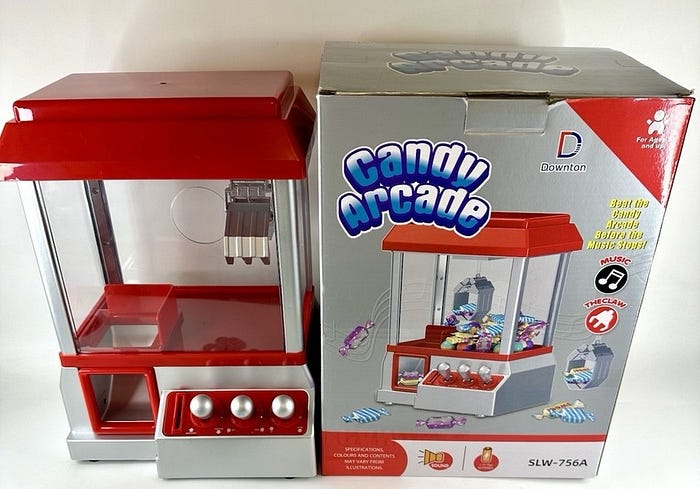 The children’s crane game used in the film is a ‘Downton Candy Arcade’ which I found in the Cancer Research charity shop on Mutley Plain on the 17th of June 2025. When used, it plays the most atrocious music at a really loud volume. Originally my plan was to use the music and crane operating noises in the film but seeing how much of a sensory nightmare it was on the day of filming my mind was changed.