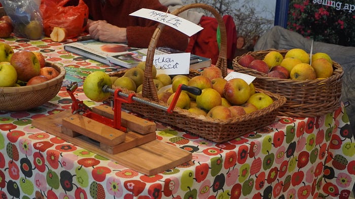Okay, so what do I mean? A lot of the apples present at the event were not pretty. They were bumpy, with some covered in dirt, and a few with nibbles here and there taken out by some bug or worm. They were not, in my mind, what comes up when I think of ‘Apple’ — some platonic ideal of red, ‘perfectly’ formed, waxed. Seeing these uncommercialised apples made me think about how a lot of our schemas of ‘the way things are’, are artificially chosen by capitalism. The ‘picture-perfect’ apples do not exist in nature really. They exist in marketing, and films, and in children’s cartoons. The idea of ‘the real-world’ vs. ‘what people think the real-world is.’
