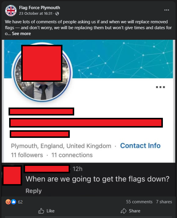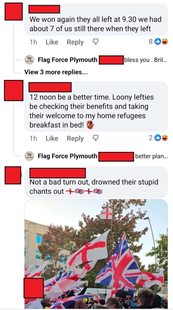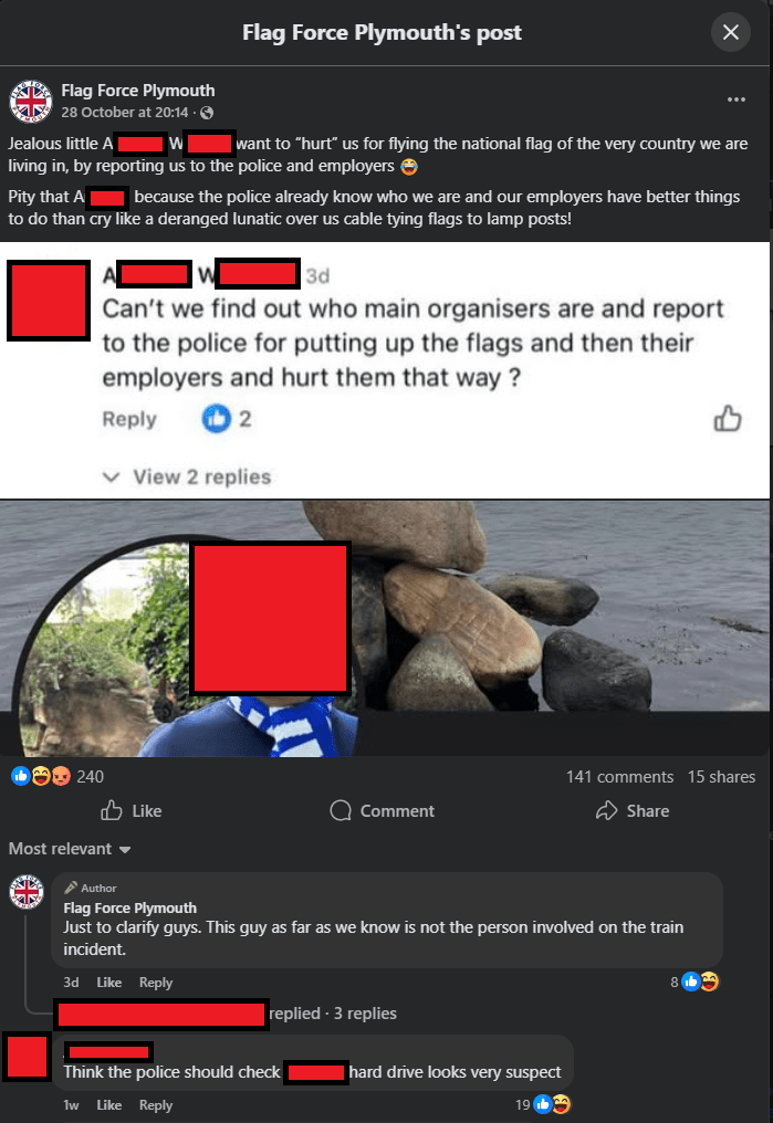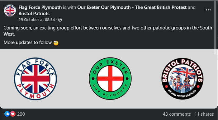 I discovered the Flag Force Facebook group on the 21st of September 2025. While this is not the only page of its kind (Our Exeter, Bristol Patriots), I will only be focusing on the Plymouth branch today.