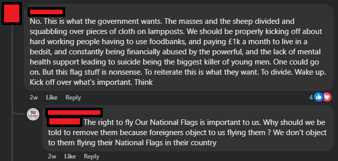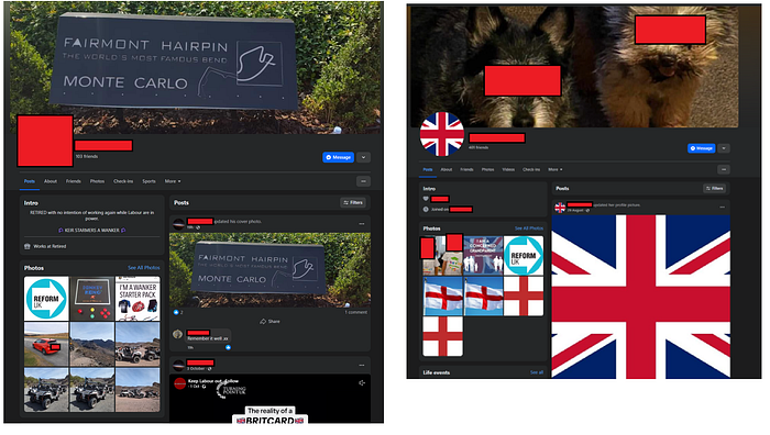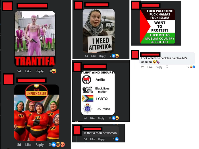 There is also the separate aspect, which I am not sure how strongly to push, but a lot of the comments on the page feel like bot behaviour. If you go to these people’s profiles, there is so much of the same content. Photos of English flags and political discourse — barely any individuality such as events they went to, family photos, just… existing… Not all of them by any means, but enough of a percentage that it does feel weird.
