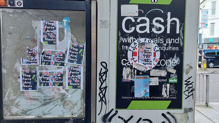 What has happened between the publishing of the video, and me writing this article? Counter-stickers have appeared throughout the city calling Flag Force Plymouth a bunch of Nazis. So that’s interesting. It is cool to see that the city is active in debate. These too have started to be torn down.
