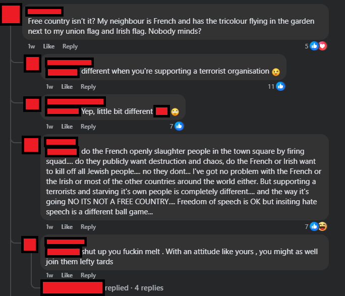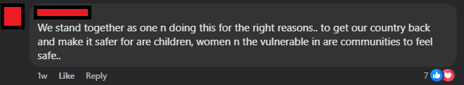 Many remarks made on the page are on the fringe of being racist. I say fringe, because often the remarks are associative rather than direct. For example, them saying things like “oh you want foreigners here, well just wait until they rape your loved ones, then we’ll see if your one changes” and they can argue “no it is culture or religion, not race”. I believe they do this so they can get away with it — going as close to the line as possible without crossing it.