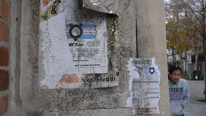 Regarding the shot of me scraping off the sticker in the end, it is something I have been doing for a while. I have been doing the same with the pro-Israel stickers, and anti-trans stickers. It is one of those things of ‘if they have the right and the power to put them up, I have the right and the power to take them down’. Many of these themes and energies were touched upon in ‘Graffiti’, and this adds some nuance to the conversation, I guess.