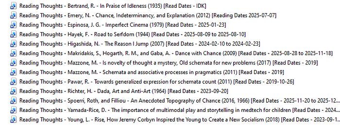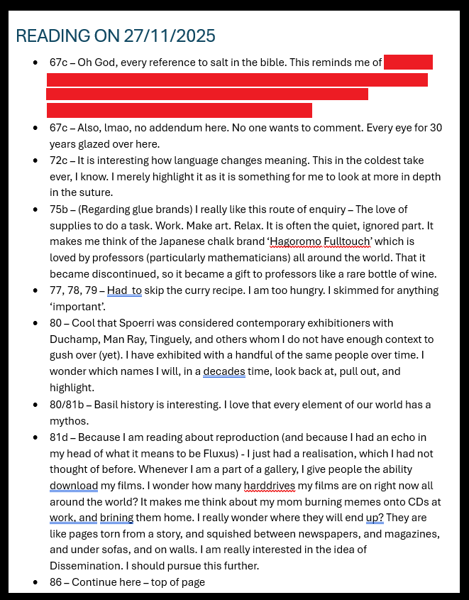 It’s funny that my notes are an annotated, anecdoted topography of chance. For this book, I ended up with 7,327 words worth of notes and reflections. It is a fun practice. Because of the notes on the screen, I can tell that this video was filmed on the 27th of November, 2025. I am lucky, to be honest, because there were some deeply personal notes one scroll up, and I did not read what the screen said when I filmed the bug.