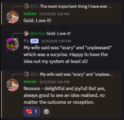 I sent the film around to see what others thought. Minim from the Post-Graduate Research Hub Discord said it was “delightful and joyful”.