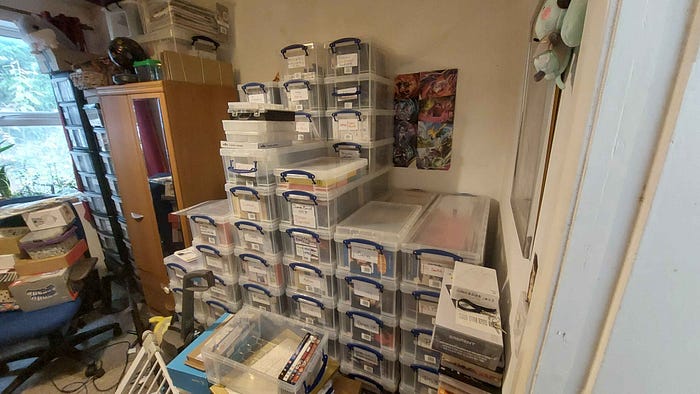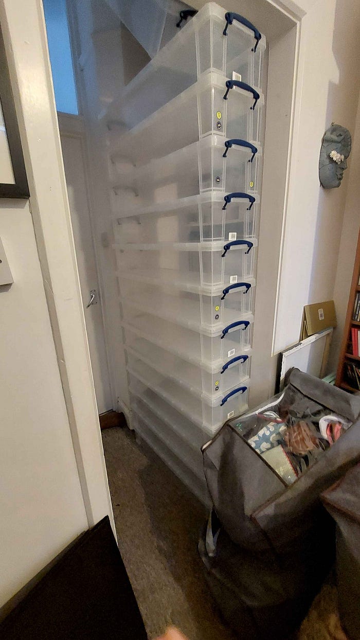 Now, the annoying thing is even though I had re-donated a majority of the DVDs, I still had all the 22l ‘Really Useful Boxes’. I did not want to get rid of these, as I felt that they could be filled with random bits we were more sentimental over and stored away. Well… It turns out that the boxes take up the same amount of space, regardless of if they are full or not. While I tried to figure out what I was going to do, I left the boxes in the passage.