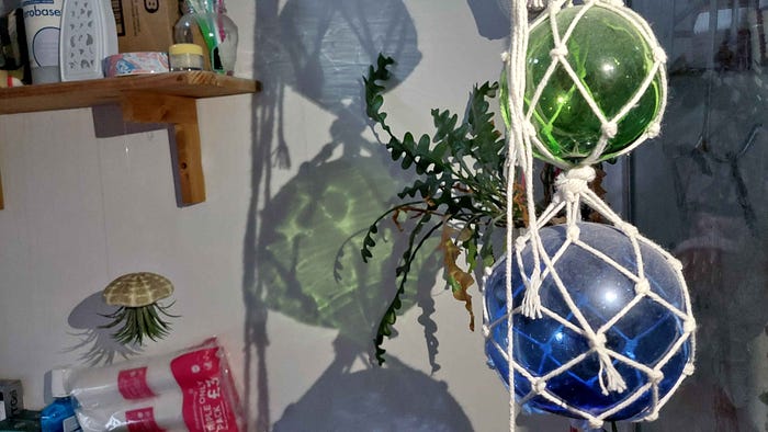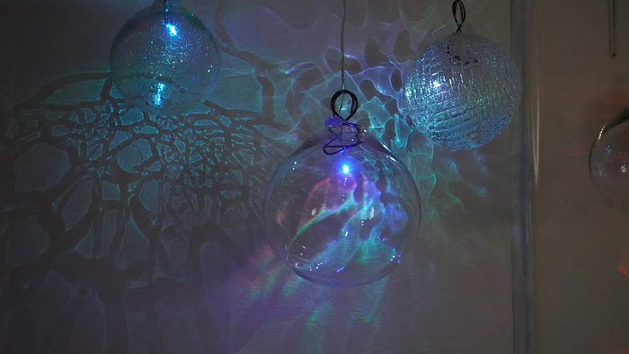 I have been interested in lights behaving like this for a while. In particular, when I go to the loo in the middle of the night, I use my phone torch rather than putting all the lights on — I don’t want to flashbang myself. When I do, the light passes through these big glass balls (glass floats for fishing) projecting some really interesting colours onto the wall.